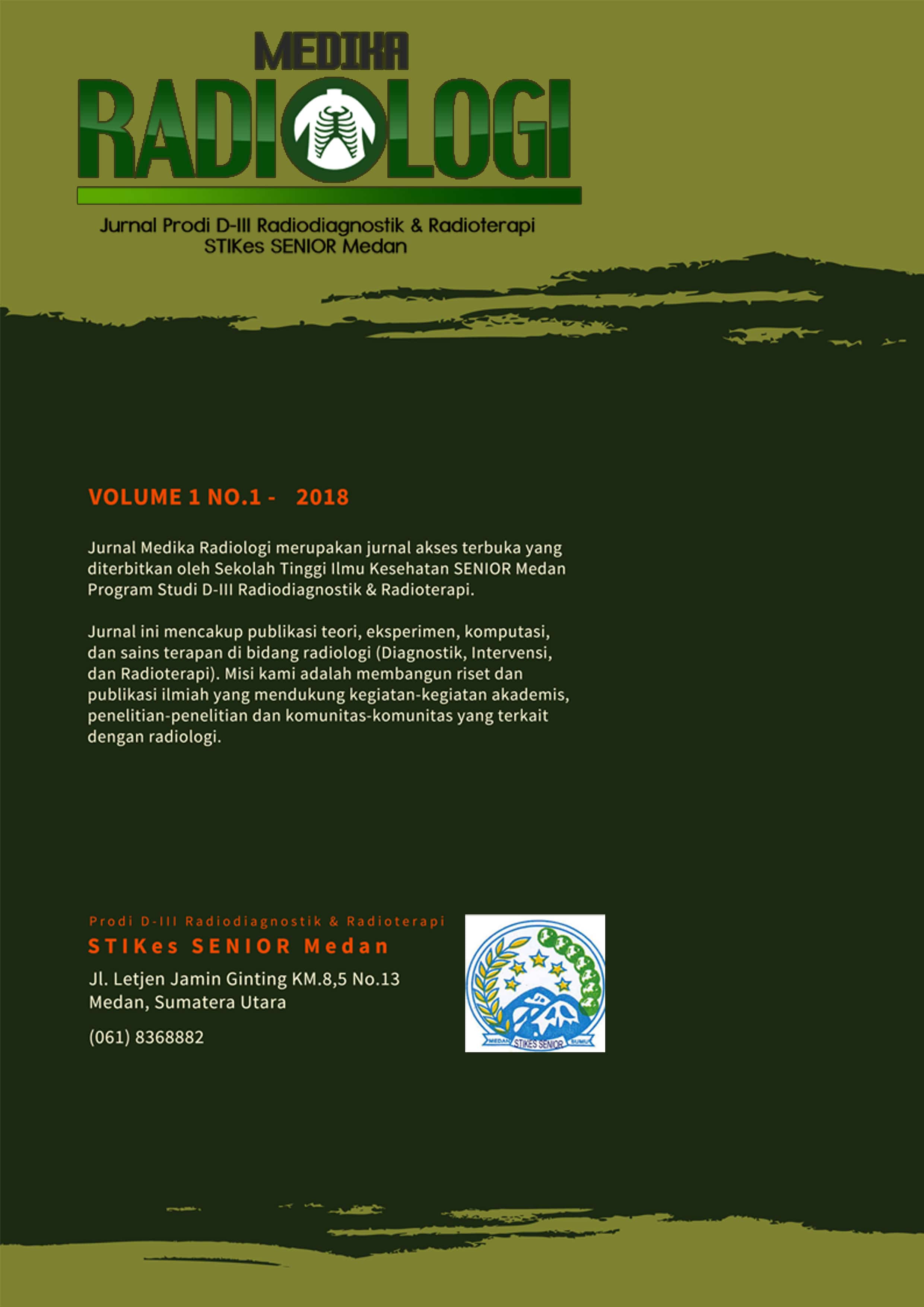 Jurnal Medika Radiologi merupakan jurnal akses terbuka yang diterbitkan oleh Sekolah Tinggi Ilmu Kesehatan SENIOR Medan Program Studi D-III Radiodiagnostik & Radioterapi. Jurnal ini mencakup publikasi teori, eksperimen, komputasi, dan sains terapan di bidang radiologi (Diagnostik, Intervensi, dan Radioterapi). Misi kami adalah membangun riset dan publikasi ilmiah yang mendukung kegiatan-kegiatan akademis, penelitian-penelitian dan komunitas-komunitas yang terkait dengan radiologi. -
